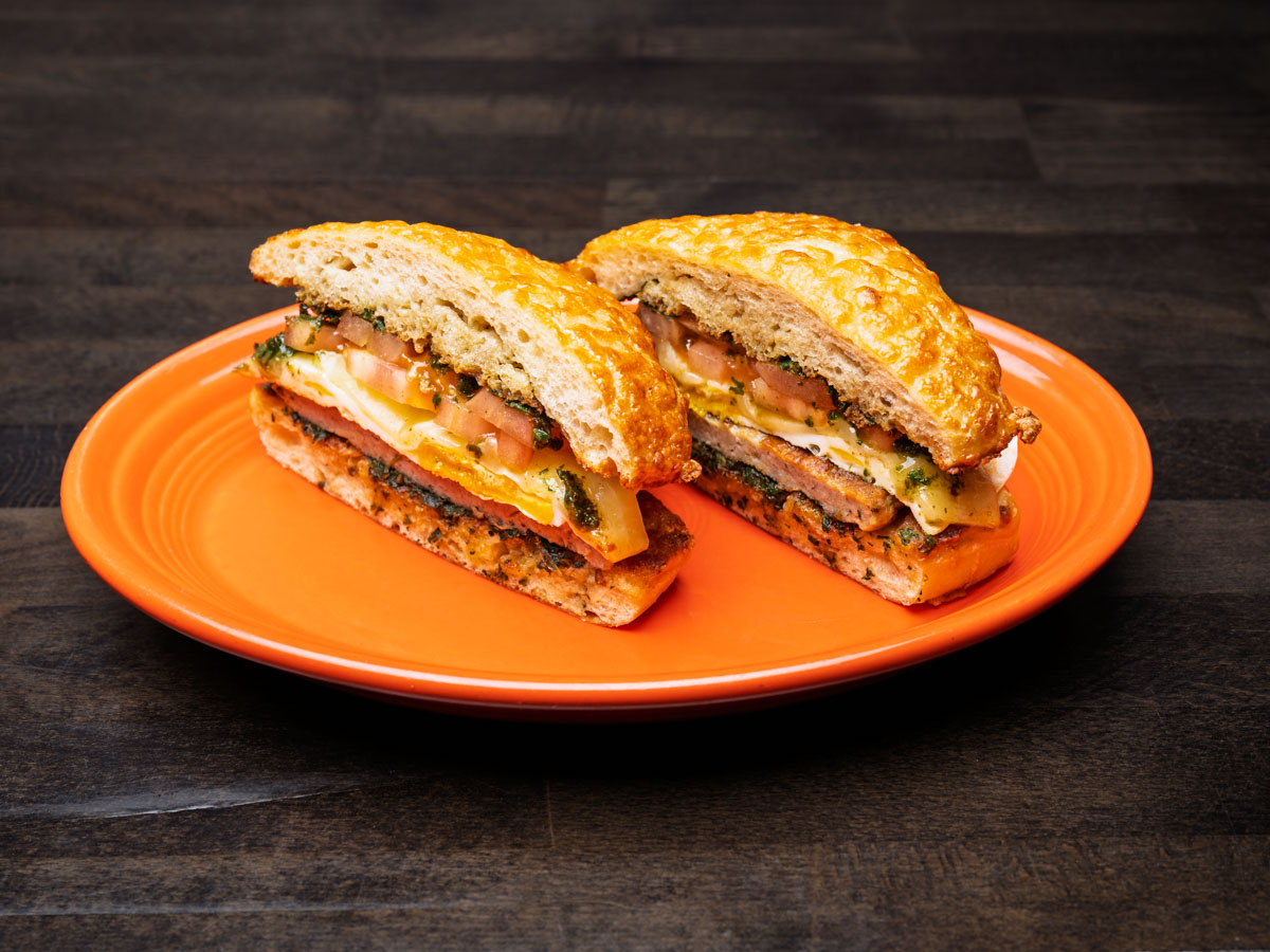 One local fried egg, sharp cheddar, tomato, sausage patty, and house made basil pesto on grilled focaccia.