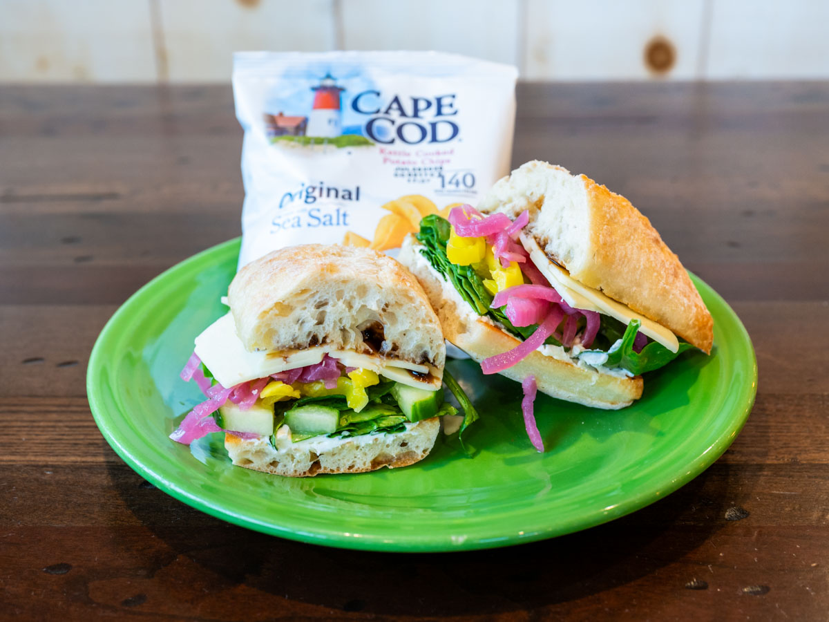 Spinach, cucumbers, banana peppers, picked red onions, cream cheese, cheddar, and balsamic glaze on grilled ciabatta.