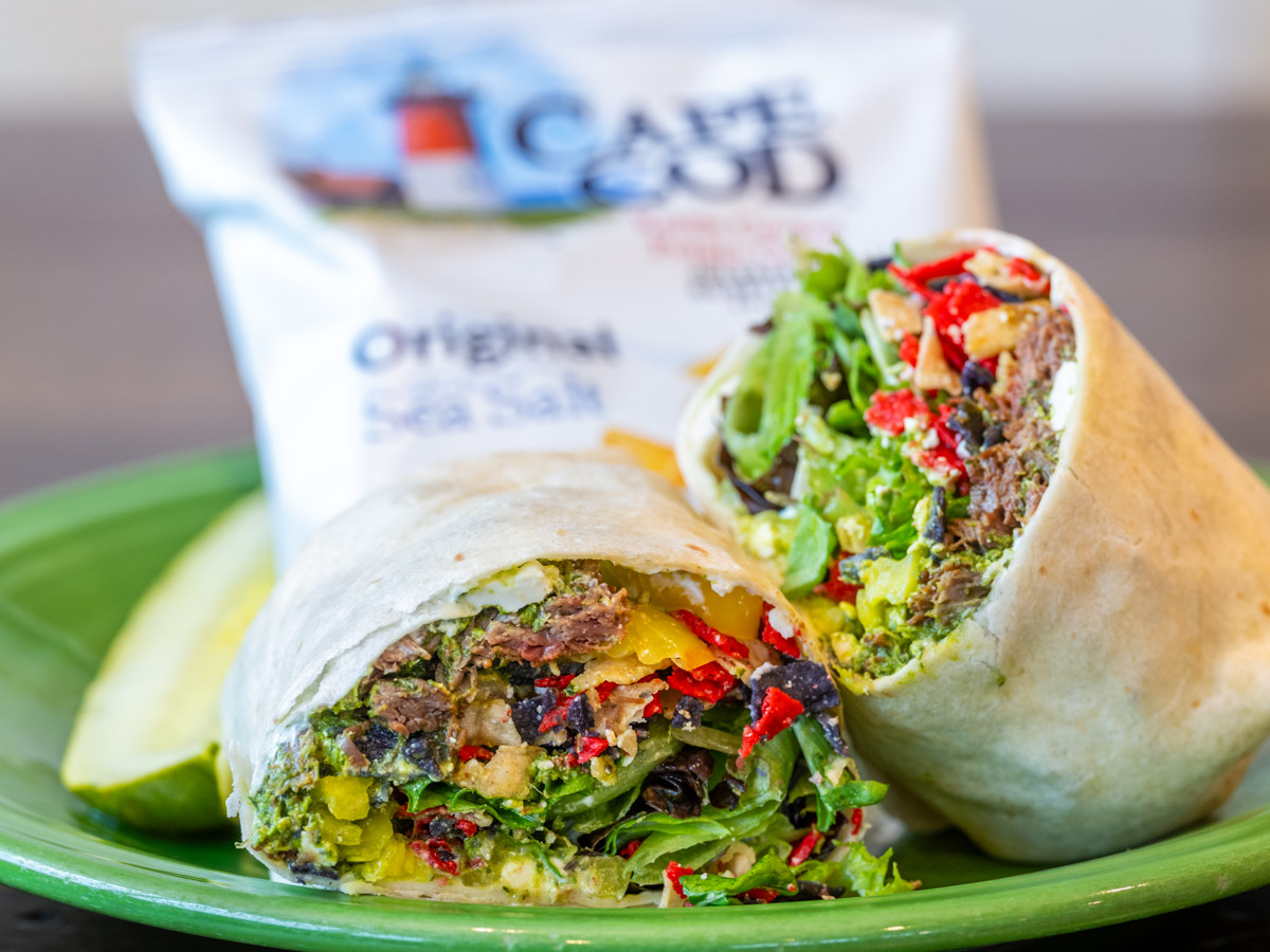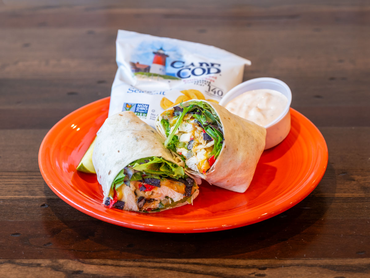Chicken salad, tomatoes, mixed greens, sharp cheddar, and honey dijon in a white wrap.