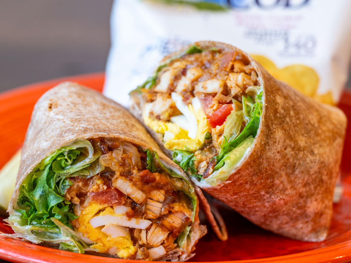 Grilled chicken, bacon, cheddar, BBQ Sauce, tomatoes, greens, hard boiled egg, and ranch on a flour tortilla.