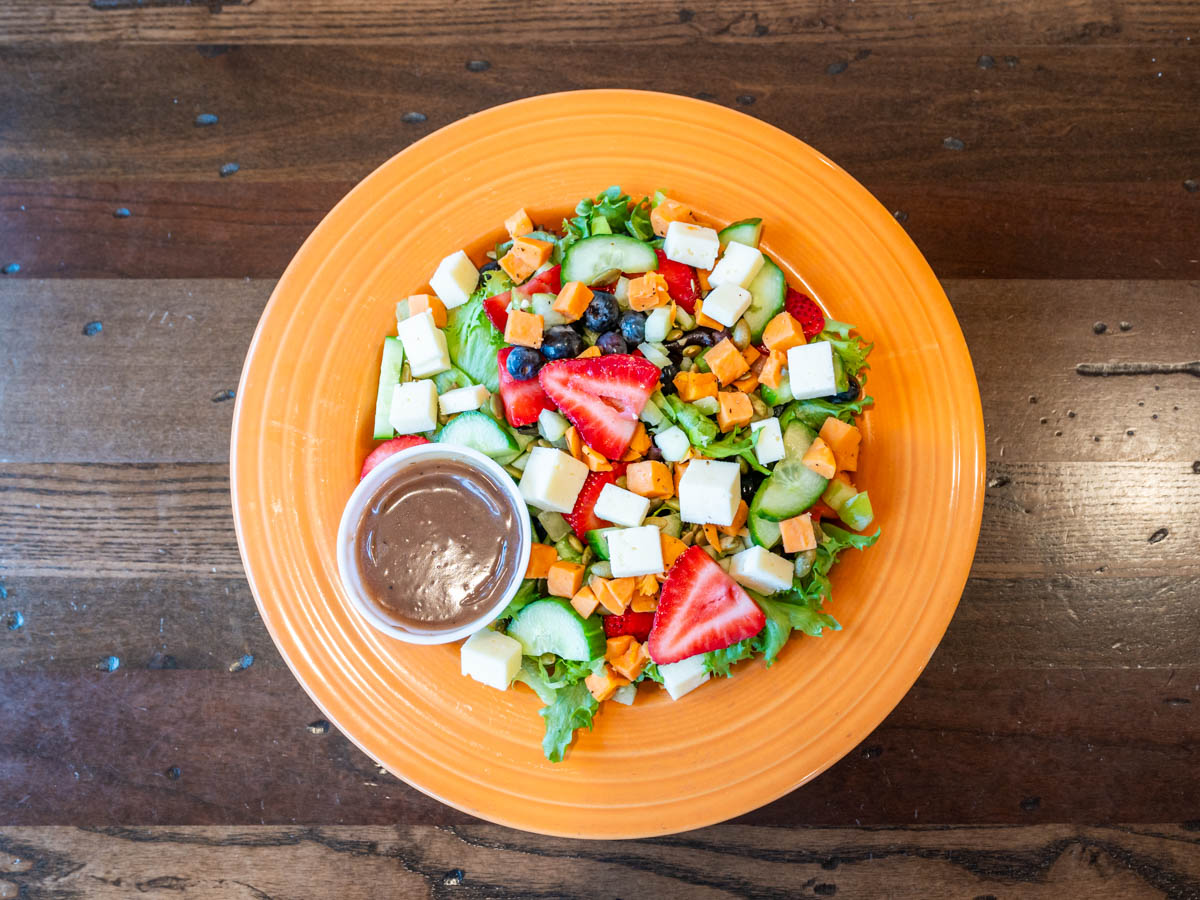 Local greens, topped with strawberries, blueberries, diced green apples, cucumbers, pumpkin seeds, sweet potatoes, and Havarti cheese. Served with homemade maple balsamic vinaigrette.