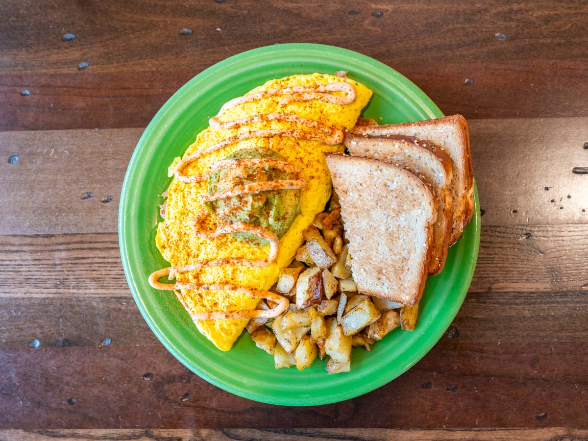 Made with three local eggs. Served with choice of house potatoes, hash browns, or baked beans, and choice of toast.